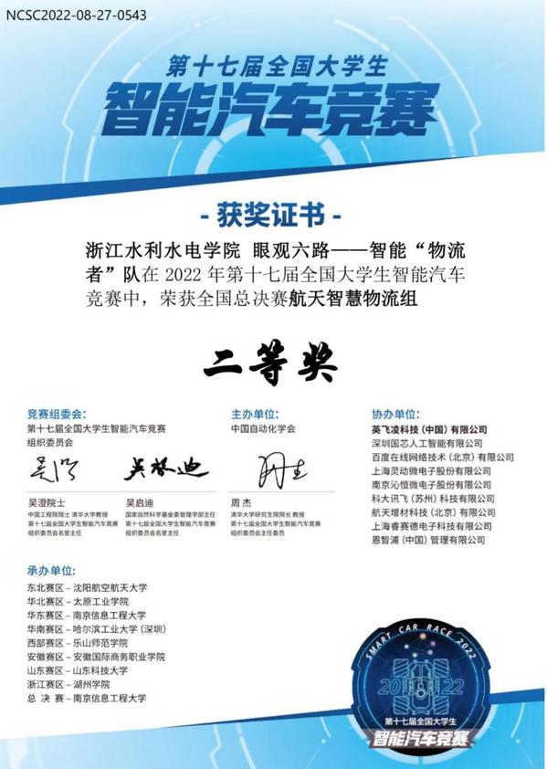 近日,第十七届全国大学生智能汽车竞赛航天智慧物流总决赛暨第三届“航天杯”移动机器人AI创新技术挑战赛圆满落幕,我校电气学院邹嘉雯、曾愉淇、叶银豪、刘嘉麟、徐殷靖等同学组成的“眼观六路——智能‘物流者’”队一路过关斩将,荣获全国二等奖,创造我校在该项赛事中的历史最好成绩。